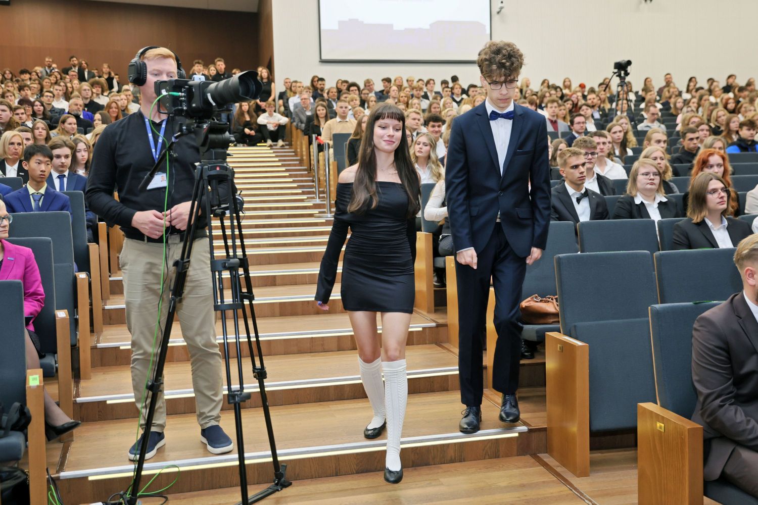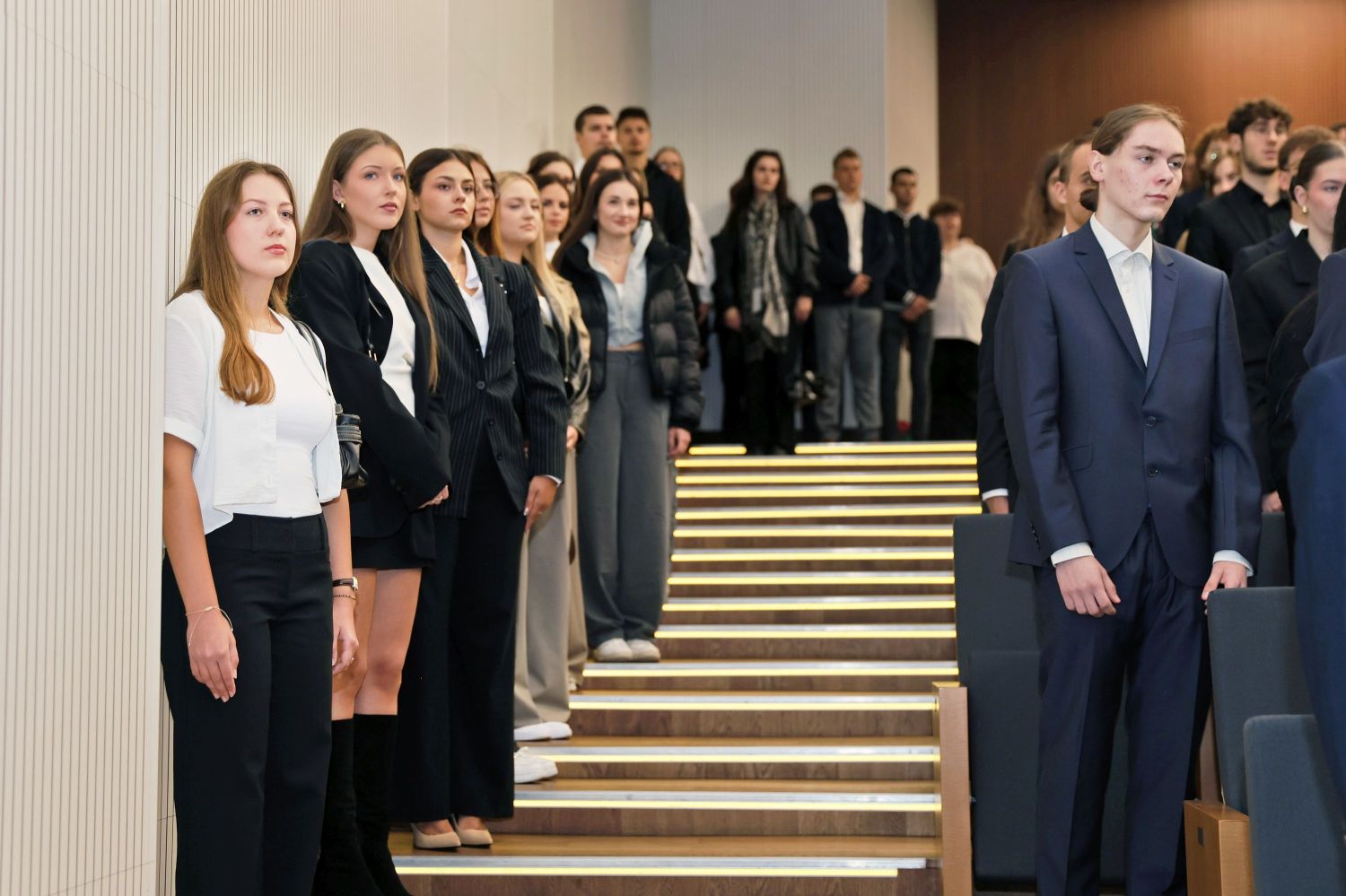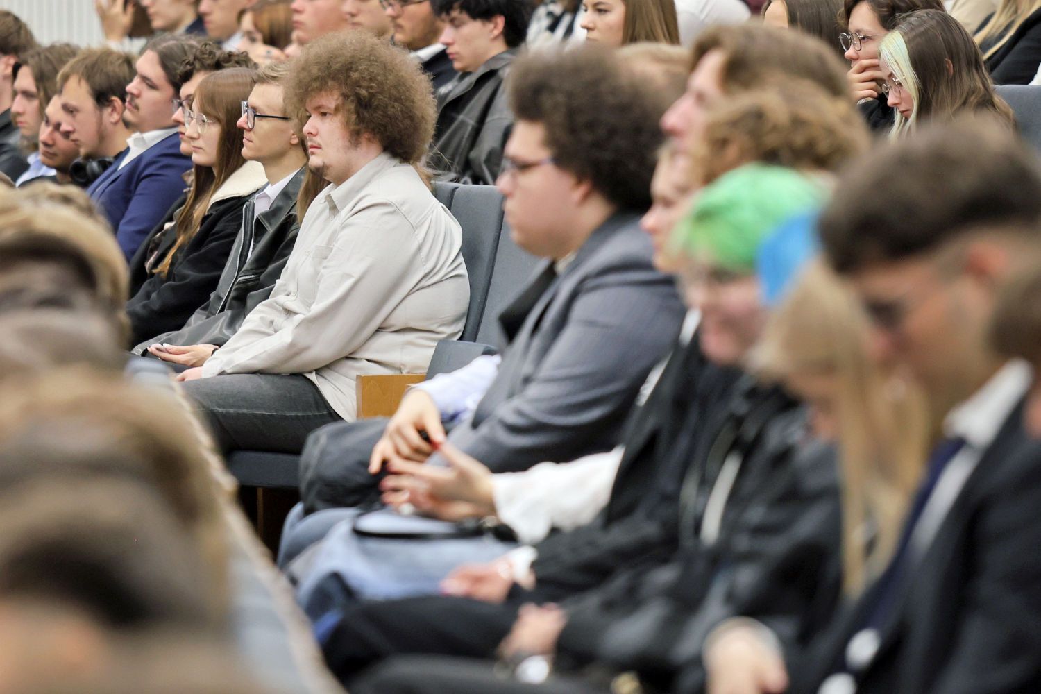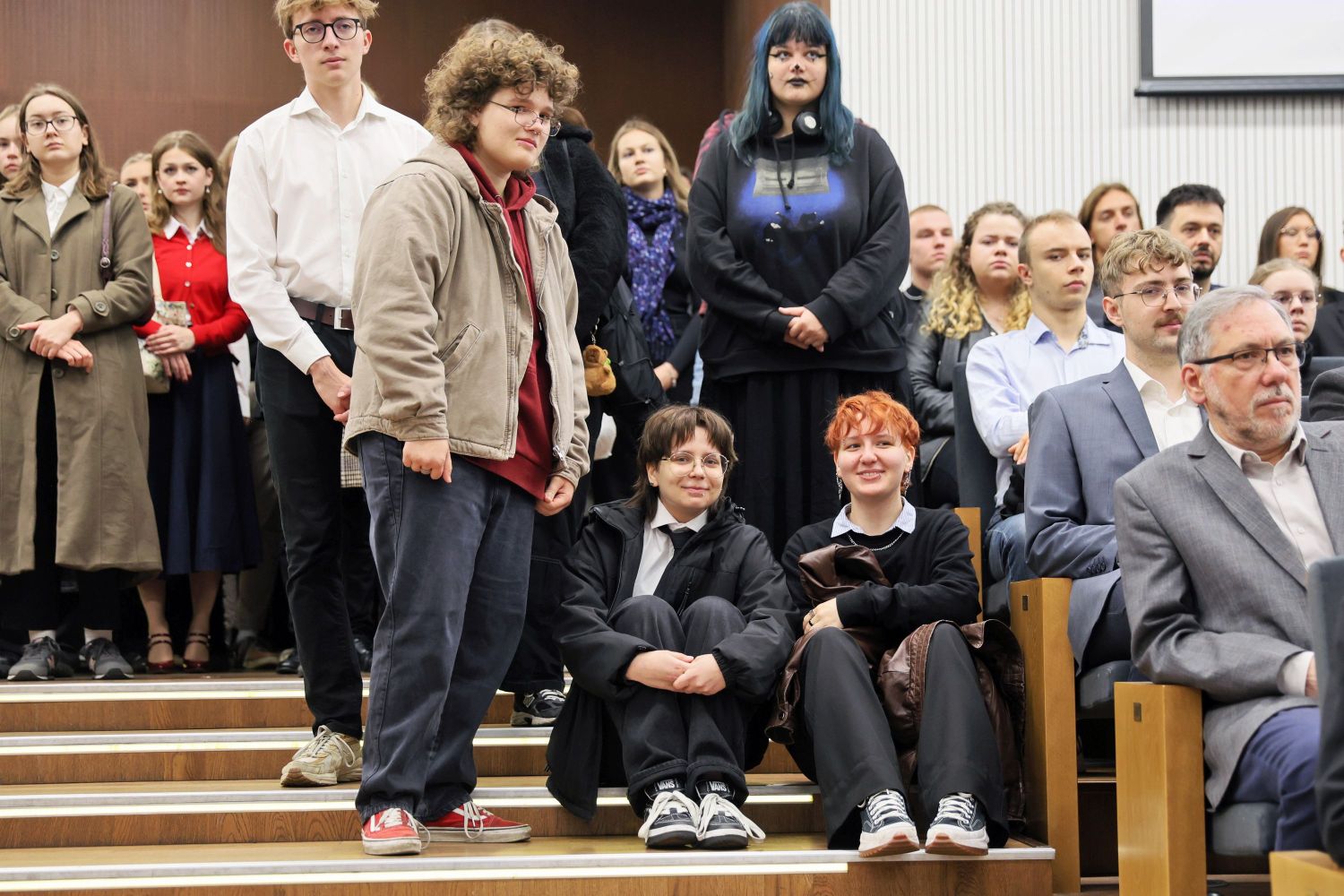 Szczególnie uroczystym punktem inauguracji była immatrykulacja, czyli symboliczne włączenie do społeczności akademickiej studentów i studentek I roku Immatrykulacja - nowo przyjęci studenci (kilkanascie osób) stoi w rzędzie na scenie Auli. Za nimi rektor odczytujący treść ślubowania Życie kampusu