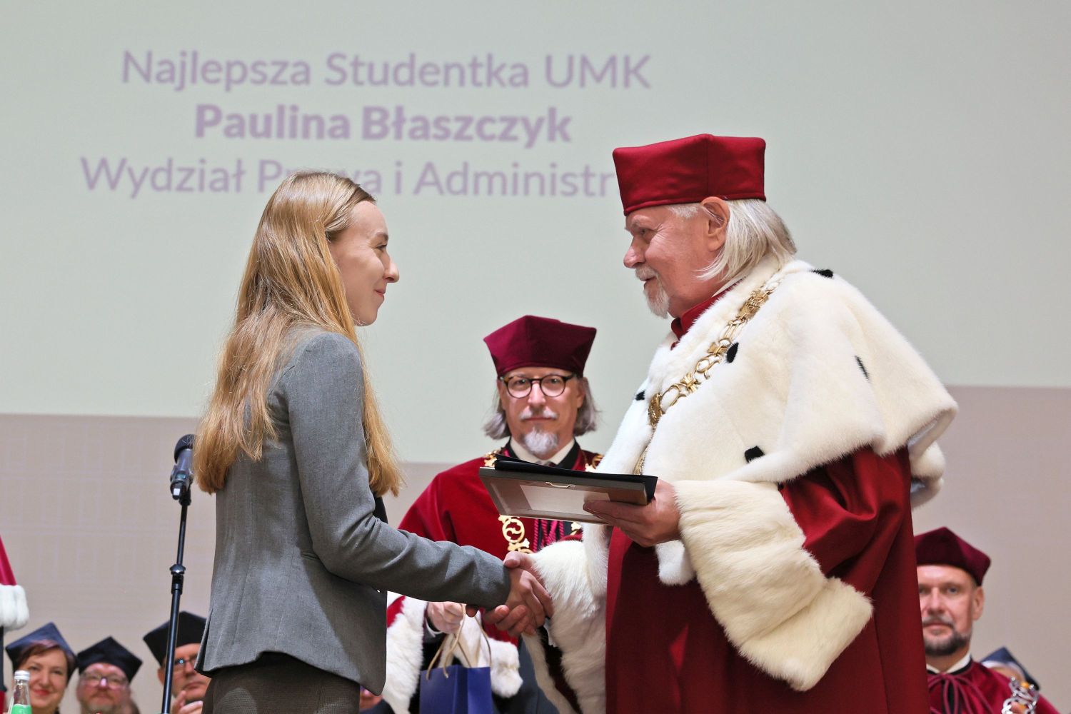 Za najlepszą studentkę UMK w minionym roku Senat uznał Paulinę Błaszczyk, studentkę IV roku prawa, która w roku akademickim 2024/2025 osiągnęła wiele sukcesów naukowych, może poszczycić się również średnią ocen w wysokości 4,96.
