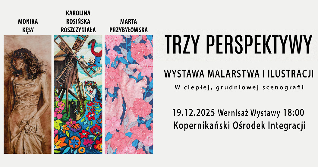 19 grudnia o godz. 18:00 w Kopernikańskim Ośrodku Integracji odbędzie się wernisaż wystawy "Trzy perspektywy". Autorkami prac, które będzie można oglądać w dużej sali budynku Integracja, są absolwentki Wydziału Sztuk Pięknych UMK: Monika Kęsy, Karolina Rosińska-Roszczyniała i Marta Przybyłowska.